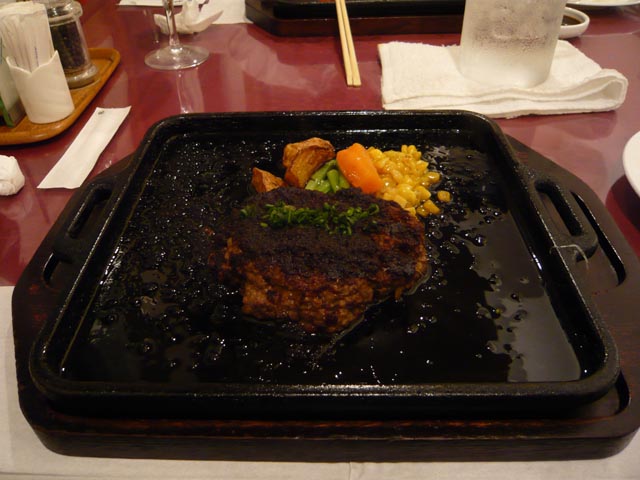 レアかミディアムか聞かれたので、後者だというと半分に切って押し付け、ソースがかけられた。かなり油が飛び散るので、事前にナフキンを持ち上げておくよう説明がある。しかし紙を1/4にしてテーブルに置くように言われた私は意味が分からず、恥をかいてしまった。しかし連れは知らなかったと言うのだが、正しい置き方ができたのだから驚きだ。