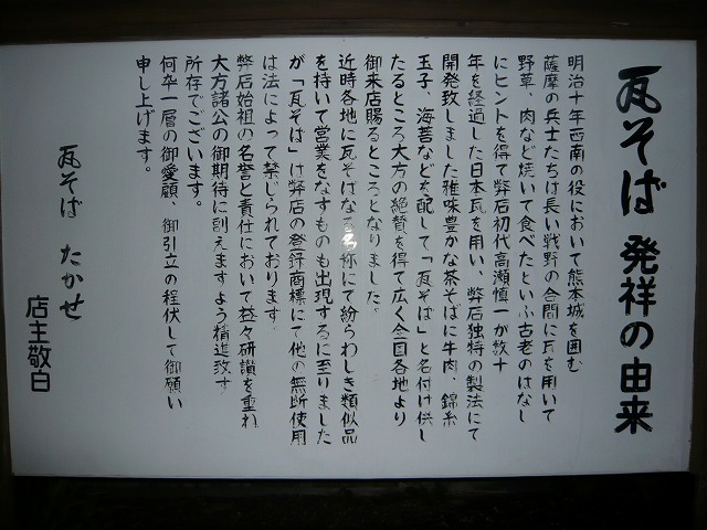 瓦そばは西南戦争で瓦を使い調理したのがきっかけで、瓦そばが生まれたそうだ 。